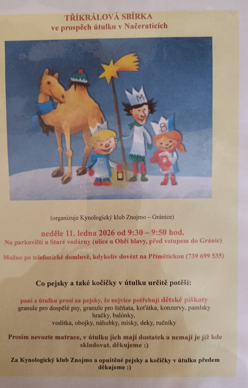 Kynologický klub Znojmo vyhlašuje tradiční materiální sbírku ve prospěch městského útulku pro psy v Načeraticích. Sbírka se uskuteční v neděli 2. prosince 2018. Přidat se samozřejmě může kdokoli - tedy i nečlen klubu. Více o sbírce naleznete v obrazové pozvánce (viz níže).