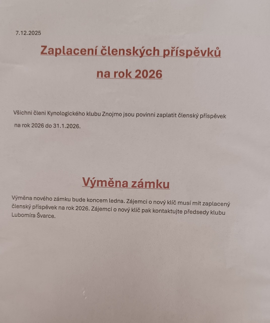 Na vstupní brance cvičáku byla provedena výměna zámku. Klíče od nového zámku jsou pro všechny členy klubu k dispozici u předsedy Františka Štěpničky.